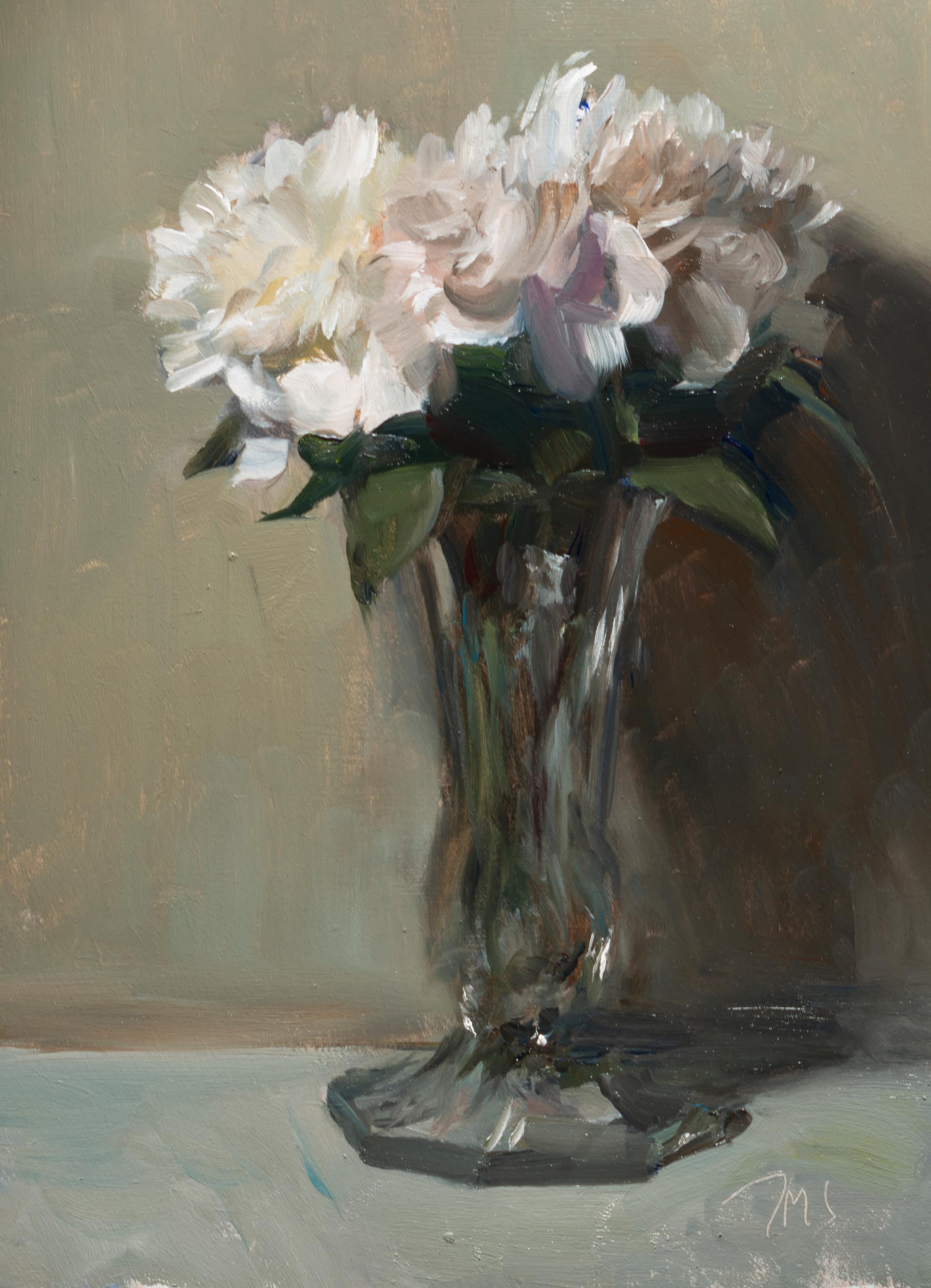 A daily painting titled "Peonies in a glass vase", One of 3950 paintings created by the British artist Julian Merrow-Smith since 2005. This project has been featured in the NYTimes, The Guardian, The Times and the Sunday Telegraph.