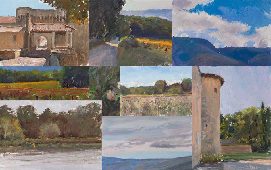 A daily painting titled "September workshop demos", One of 3900 paintings created by the British artist Julian Merrow-Smith since 2005. This project has been featured in the NYTimes, The Guardian, The Times and the Sunday Telegraph.