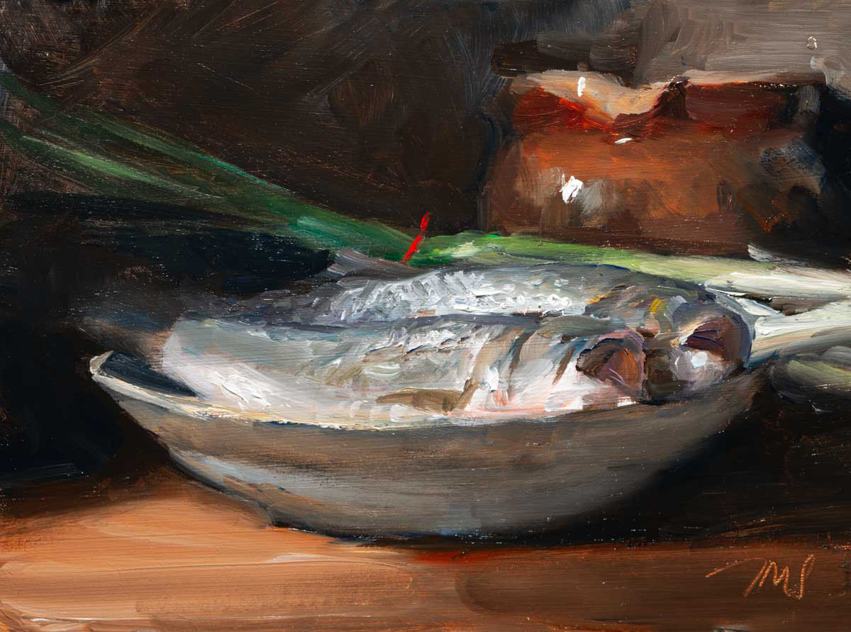 A daily painting titled "Sea bass and spring onions", One of 3915 paintings created by the British artist Julian Merrow-Smith since 2005. This project has been featured in the NYTimes, The Guardian, The Times and the Sunday Telegraph.