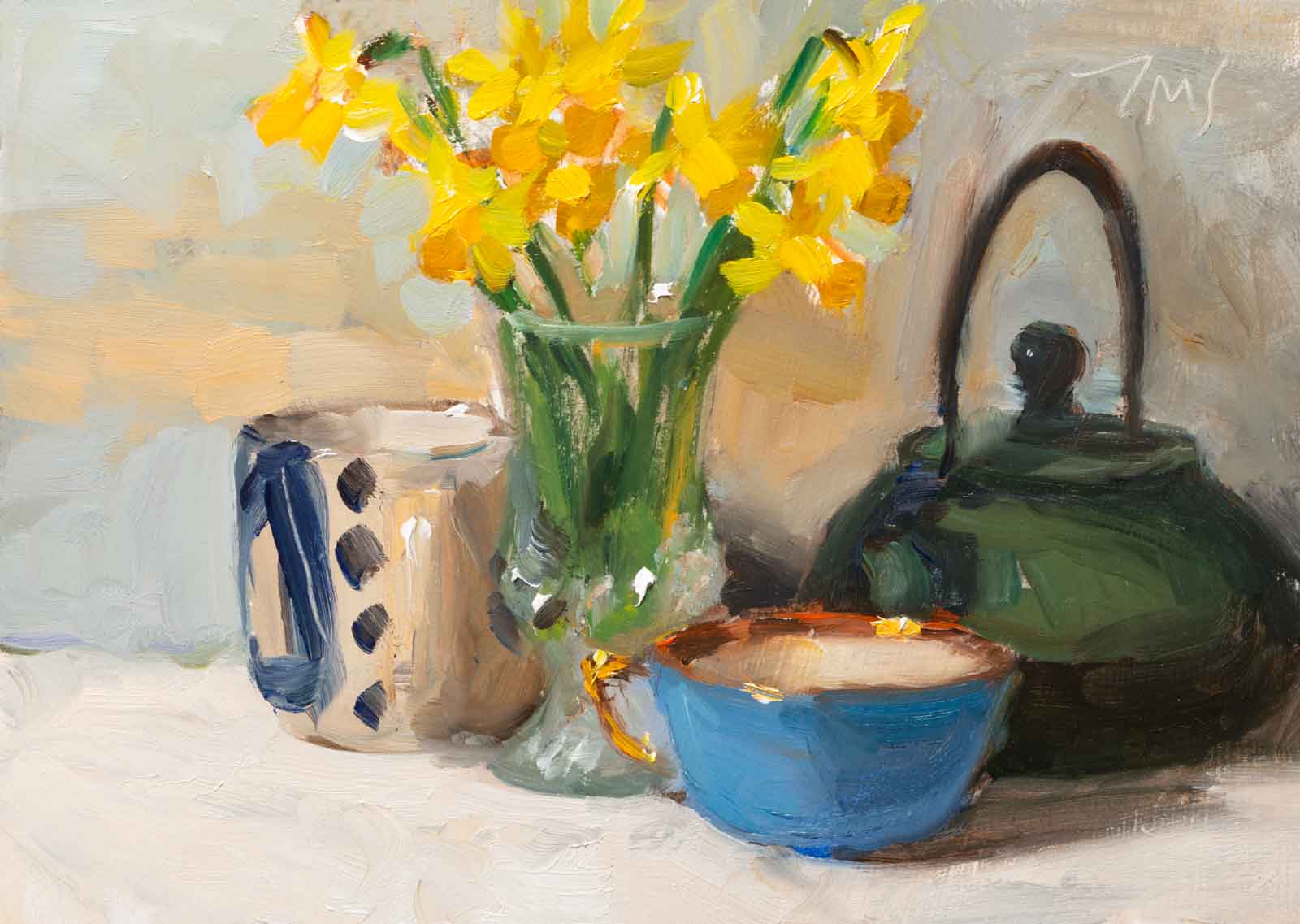 A daily painting titled "Still life with jonquils", One of 3943 paintings created by the British artist Julian Merrow-Smith since 2005. This project has been featured in the NYTimes, The Guardian, The Times and the Sunday Telegraph.