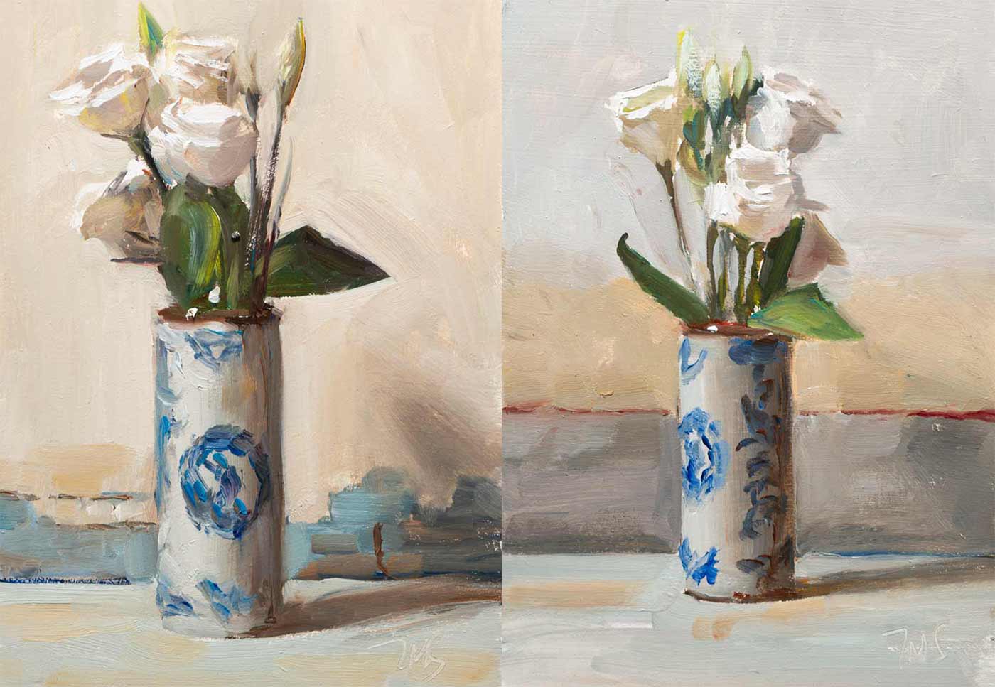 Lisianthus in a Chinese vase #1 & #2 a daily painting by Julian Merrow-Smith