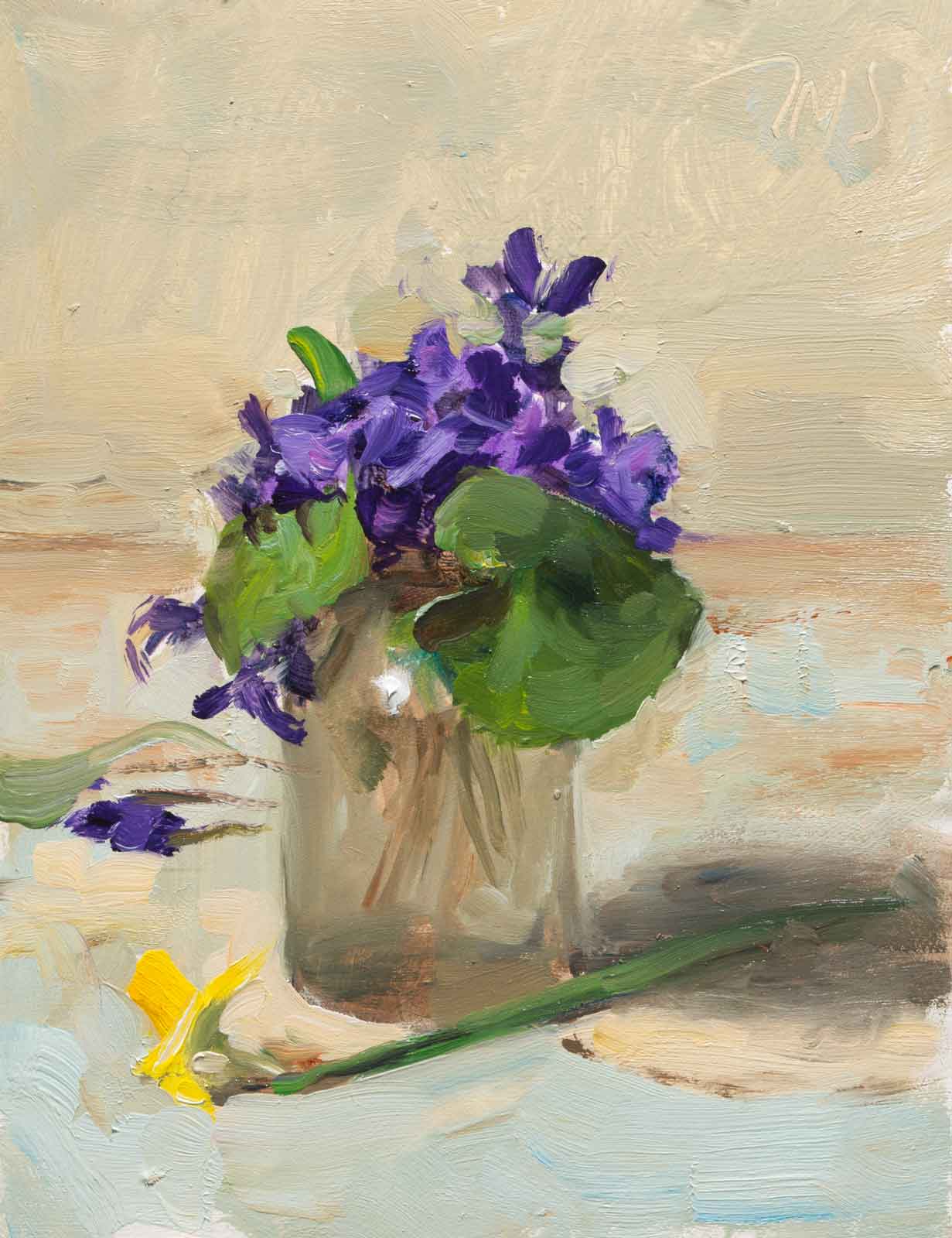 Violets in an old ink bottle a daily painting by Julian Merrow-Smith